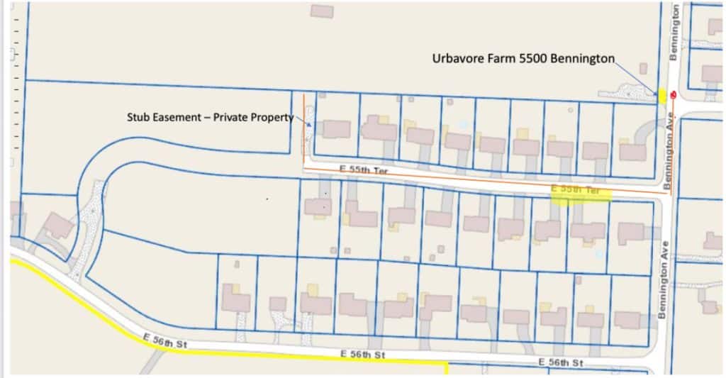 The underdeveloped street off of 55th Terrace was never extended, and the city retained the right to allow access to it through easement — a legal agreement permitting the use of someone else’s land without owning it. Through this easement, the area would later become the entrance to Urbavore Farm’s composting facilities.