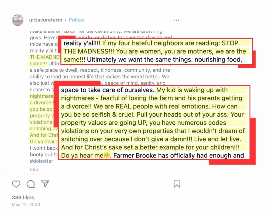 It’s because “Save the Farm” is the perfect rallying cry for a campaign rooted in self-serving advocacy. It allows Brooke Salvaggio — as the outspoken mouthpiece for Urbavore and CCKC — to create inflammatory rhetoric about her Black neighbors. It has allowed her 16,000 online supporters (both Instagram and Facebook) to believe something that is not true. It enables Salvaggio to manufacture white victimhood and cloak virtue signaling in language that advances a micro-colonial agenda.