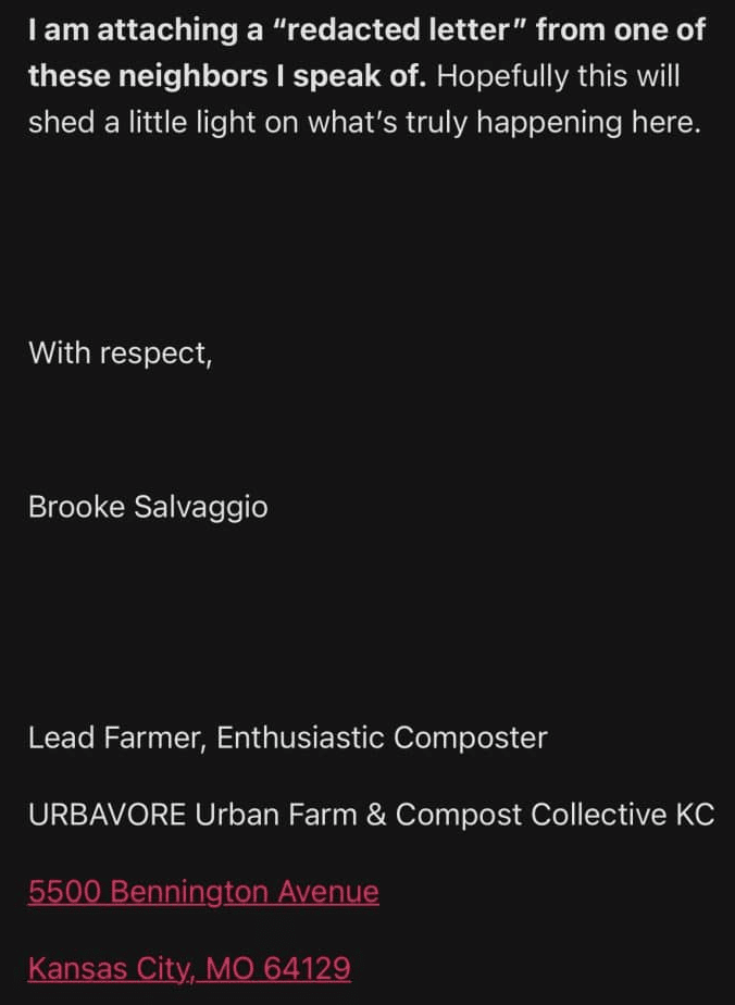 In an op-ed penned to SWAAY, mental health advocate and author McKenna Kelley writes “Performative activism makes us question if people are actually changing their mindsets or simply appearing to do so.” In Salvaggio’s case, the latter applies. While Salvaggio may tote this “supportive neighbor of color” in her email communications, there are hardly any Black supporters or local Black farmers who side with Salvaggio on this matter publicly. In fact, even Salvaggio admits that 63% of their compost subscribers live in the 6th district — a district that sits west of the racial dividing line known as Troost Avenue and is historically white.