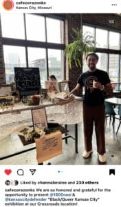 In early 2023, after researching Volume 1 of the project, Montalvo morphed these archival materials into a multi-location, self-service exhibit from February 27th – March 4th, 2023 hosted at different locations across Kansas City–with each location hosting different materials from the volume. Montalvo did this to increase open-access and knowledge of the “stamp” Black queer Kansas Citians have made on the City. In picking exhibit locations across the City, Montalvoa lso wanted to explore various aspects of Blackness: Montalvo chose a coffee shop in the historic Northeast to break down harmful misconceptions about the neighborhood, Café Corazón to show solidarity between Black and Latin American communities and honor Montalvo’s own Afro-Latine identity, and a radical bookstore to illustrate commitment to solidarity building.