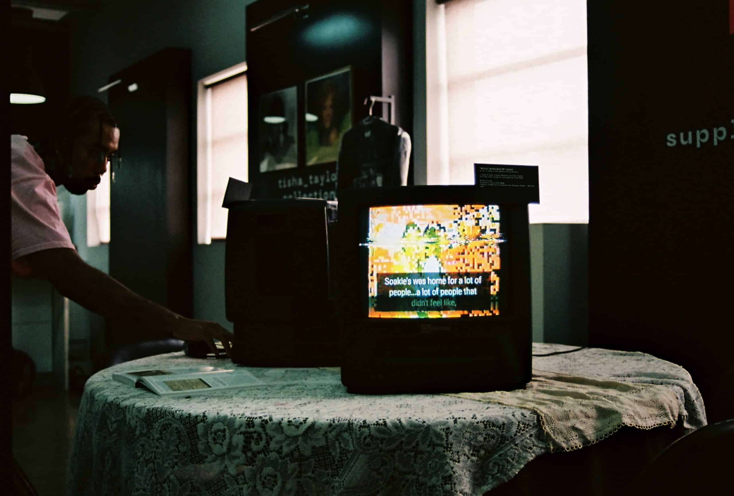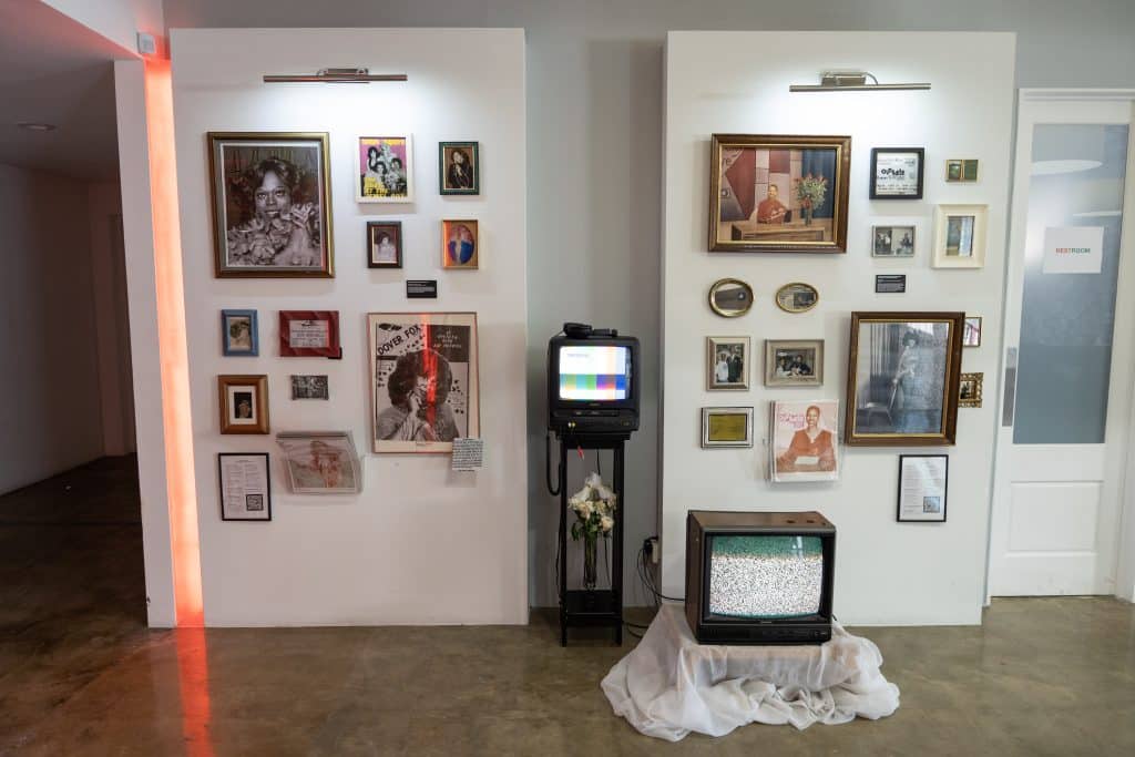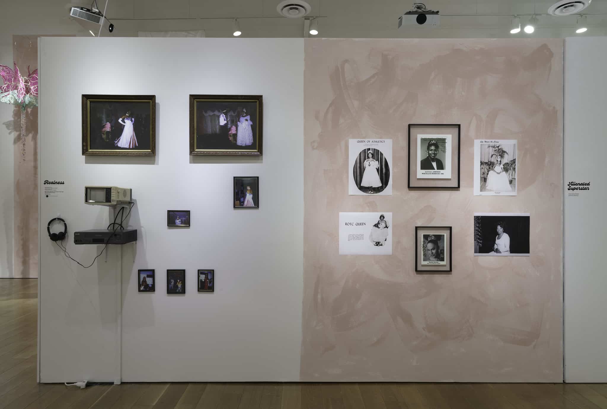 {B/qKC}‘s installs utilize vintage framing, VCRs and miniature televisions to present its collected material and research on Soakie’s in juxtaposing the surrealist elements in the show–specifically examining Black queer pageantry through the lens of Black masculine lesbians, drag queens, and guided by video storytelling as told by Tisha Taylor.