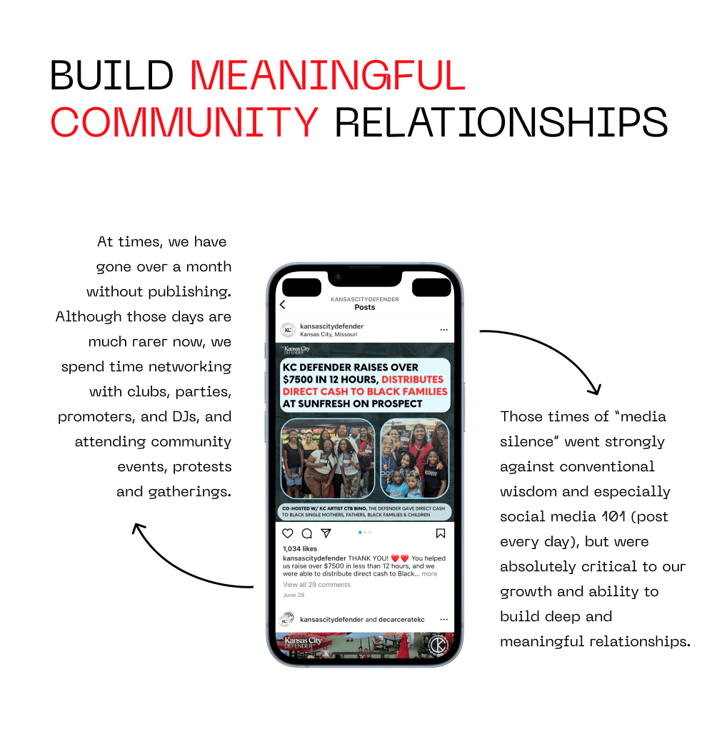 The Kansas City Defender’s structure is built around three integral community driven committees: Mutual Aid, Arts & Culture, and Political Education. Each committee is led by our dedicated staff members and organizers who coordinate efforts and ensure alignment with our mission.