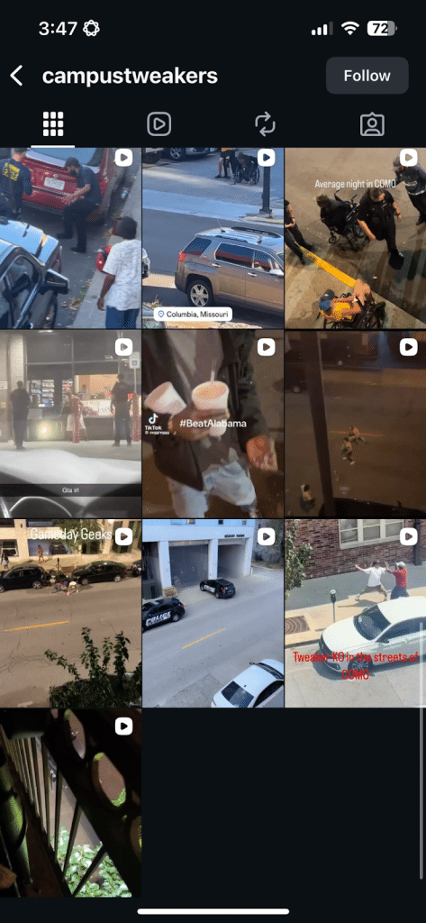 On social media, public scrutiny of unhoused residents has intensified. One Instagram post from the account @campustweakers showed clips from Homecoming weekend of unhoused people in extreme distress or interacting with police. One clip depicts an unhoused man being placed in a chokehold by another man during Mizzou homecoming, followed by footage of the same man being restrained while flailing his arms. That video has garnered nearly 3,300 likes.