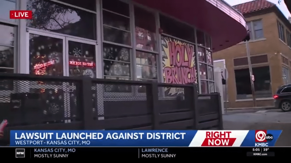 KMBC broadcast live from Westport with “Lawsuit Launched Against District” displayed while the Holy Brunch logo filled the screen.
