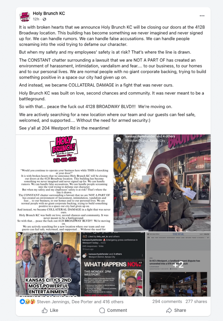 In January 2025, Euphoric, LLC, owned by Black restaurateur Christopher Lee, filed a federal RICO lawsuit against the all-white Westport Community Improvement District (a small group of powerful individuals who control what businesses do and don’t get to open in Westport) and the owners of 4128 Broadway, the building Holy Brunch currently occupies.
