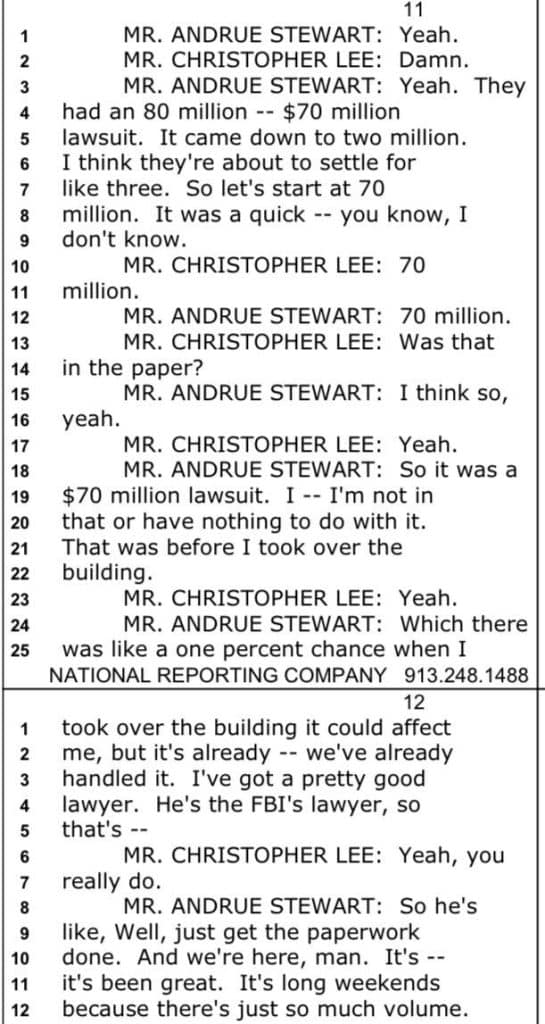 Let us pause here. Mr. Stewart is casually discussing, in granular detail, a $70 million lawsuit attached to the very building he chose to lease. He is not learning about this for the first time. He is recounting it like someone who has done his homework.