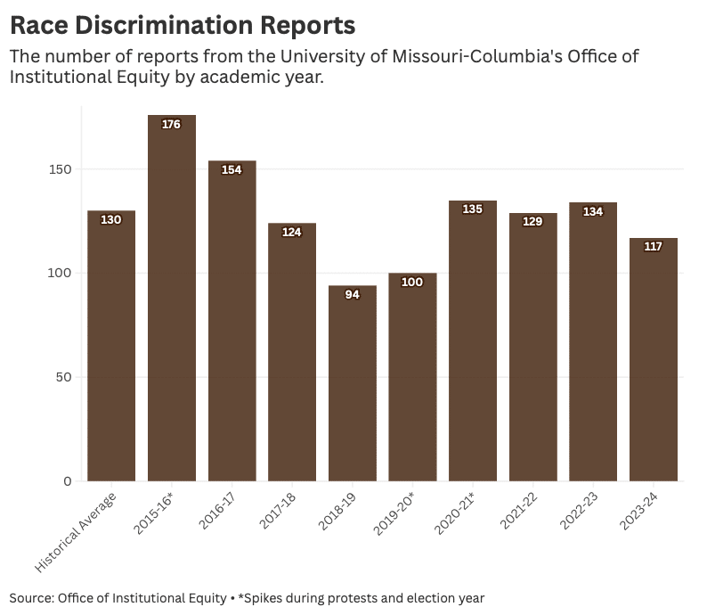 In the years after Concerned Student 1950, MU tightened its rules on campus protest, banning encampments without administrative approval. The Office of Institutional Equity began publishing race discrimination statistics, which initially declined after 2015 but began rising again around the 2020 election cycle.
