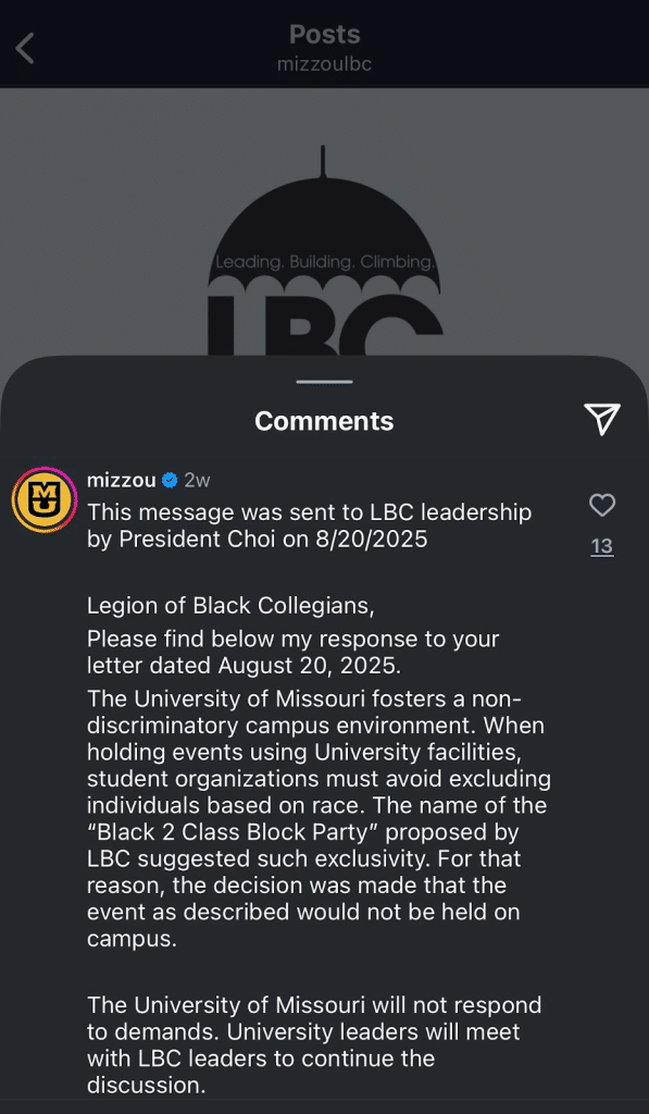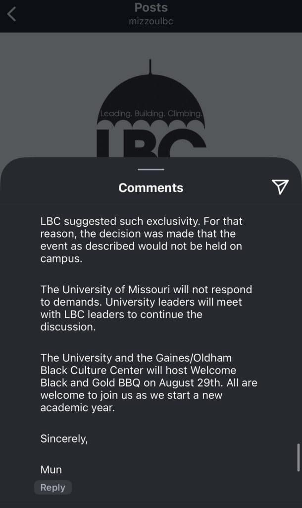 The Welcome Black & Gold BBQ mentioned in Mizzou’s response was originally called the Welcome Black BBQ, which was held annually at the GOBCC and hosted by LBC. The organization made a post ahead of the 2024-2025 academic year that they fought to keep the original name and message, but the new name prevailed.