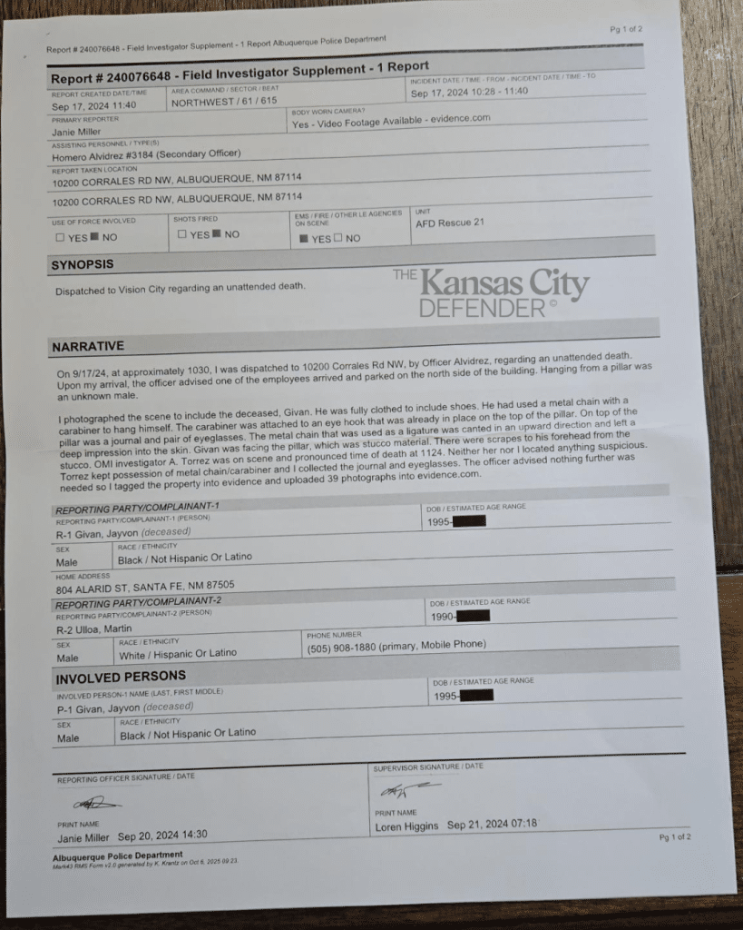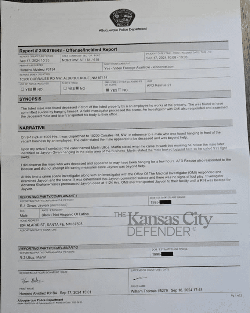 According to the primary report filed by Officer Homero Alvidrez on September 17, 2024, an employee at 10200 Corrales Road NW called 911 at 10:09 AM after discovering Jayvon’s body “hanging in front of the listed property.” The synopsis states: “The listed male was found deceased in front of the listed property by an employee who works at the property. Was found to have committed suicide by hanging himself.”