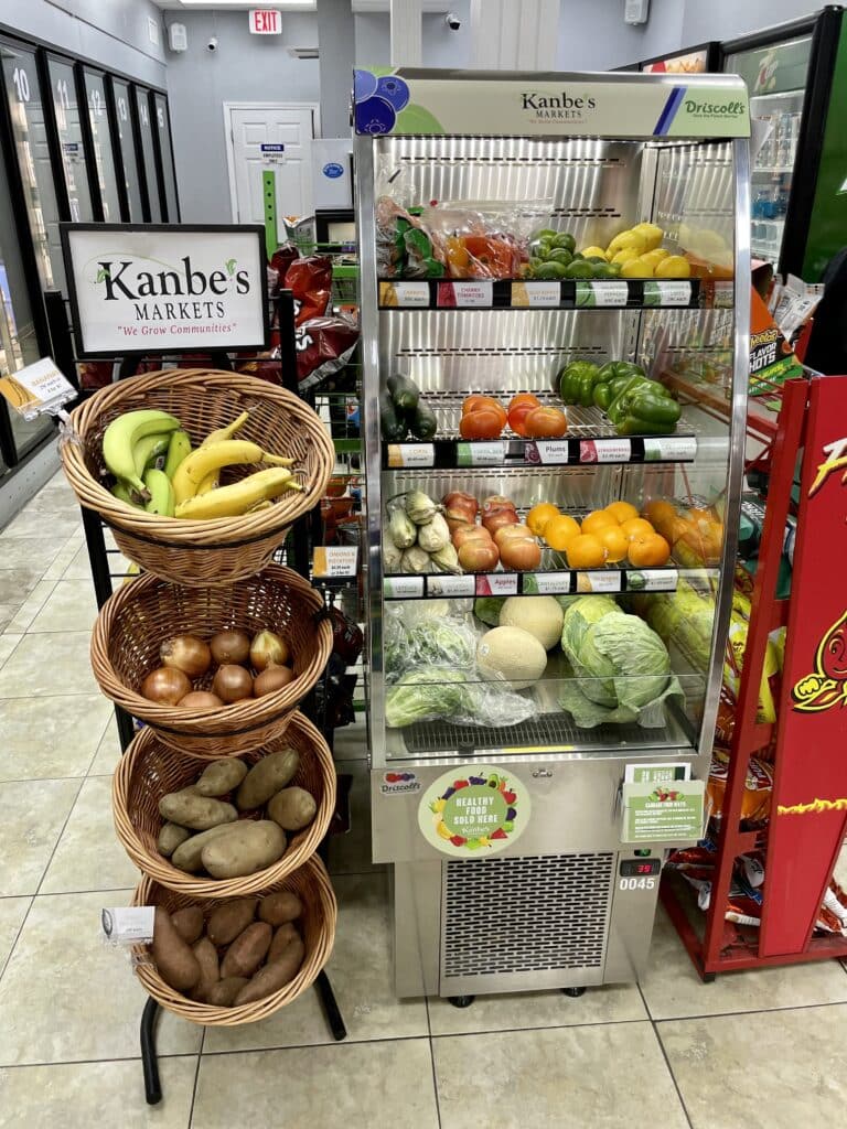 Check out your local convenience store, gas station, or corner bodega for the Kanbe’s Markets fridge, a three-tiered cooler lined with a colorful display of fresh fruits and vegetables.