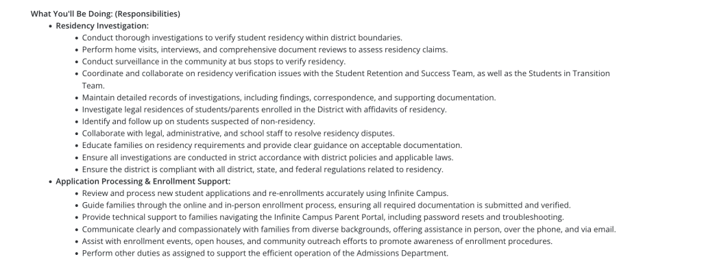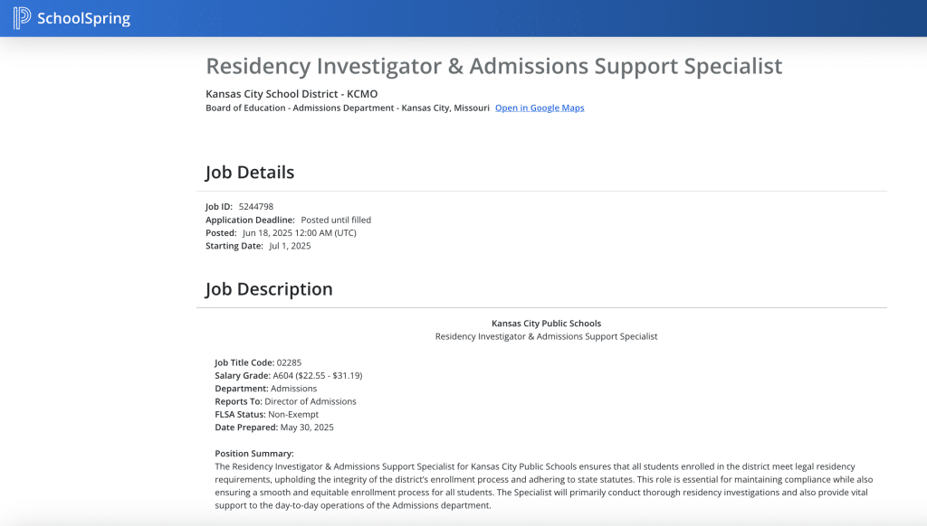 Buried on SchoolSpring’s job board is a Kansas City Public Schools (KCPS) listing for a “Residency Investigator & Admissions Support Specialist.” On paper, the post claims to “uphold the integrity of the district’s enrollment process.” In reality, it reads like a blueprint for a miniature police state inside our classrooms.