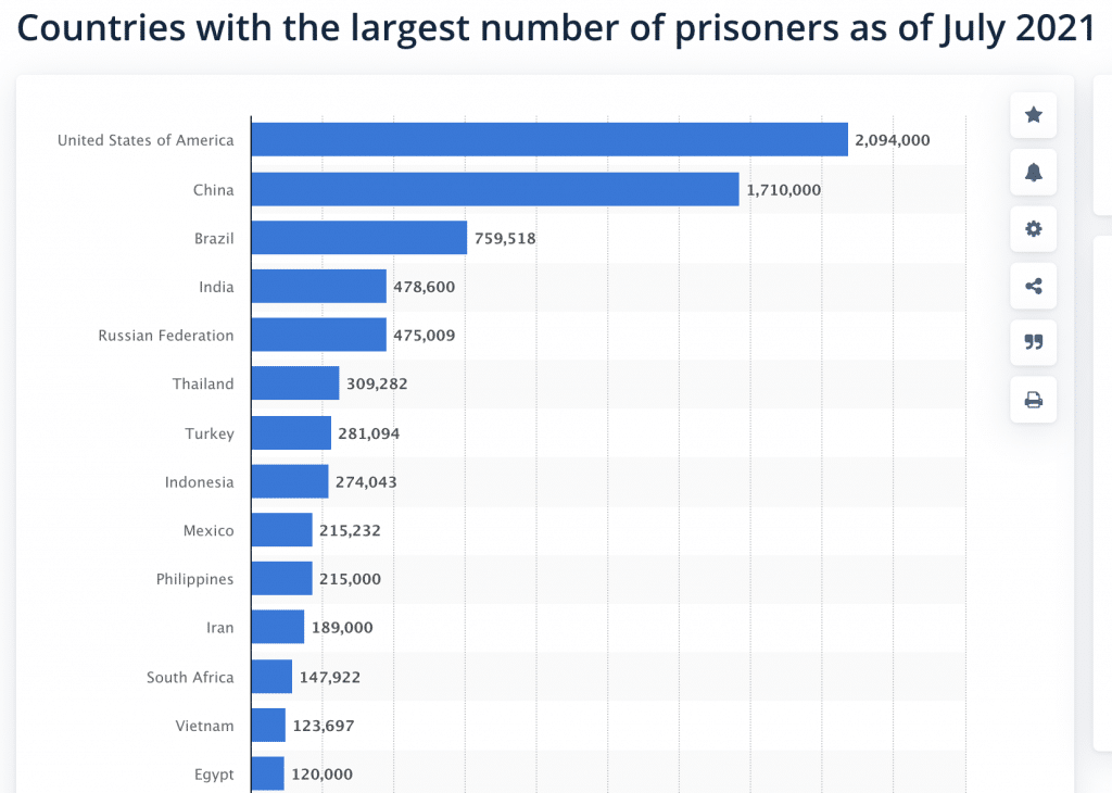 Or that the US has a larger prison population than China even though China has a population literally one billion people larger than ours. We nearly have a larger prison population than China and Russia combined.