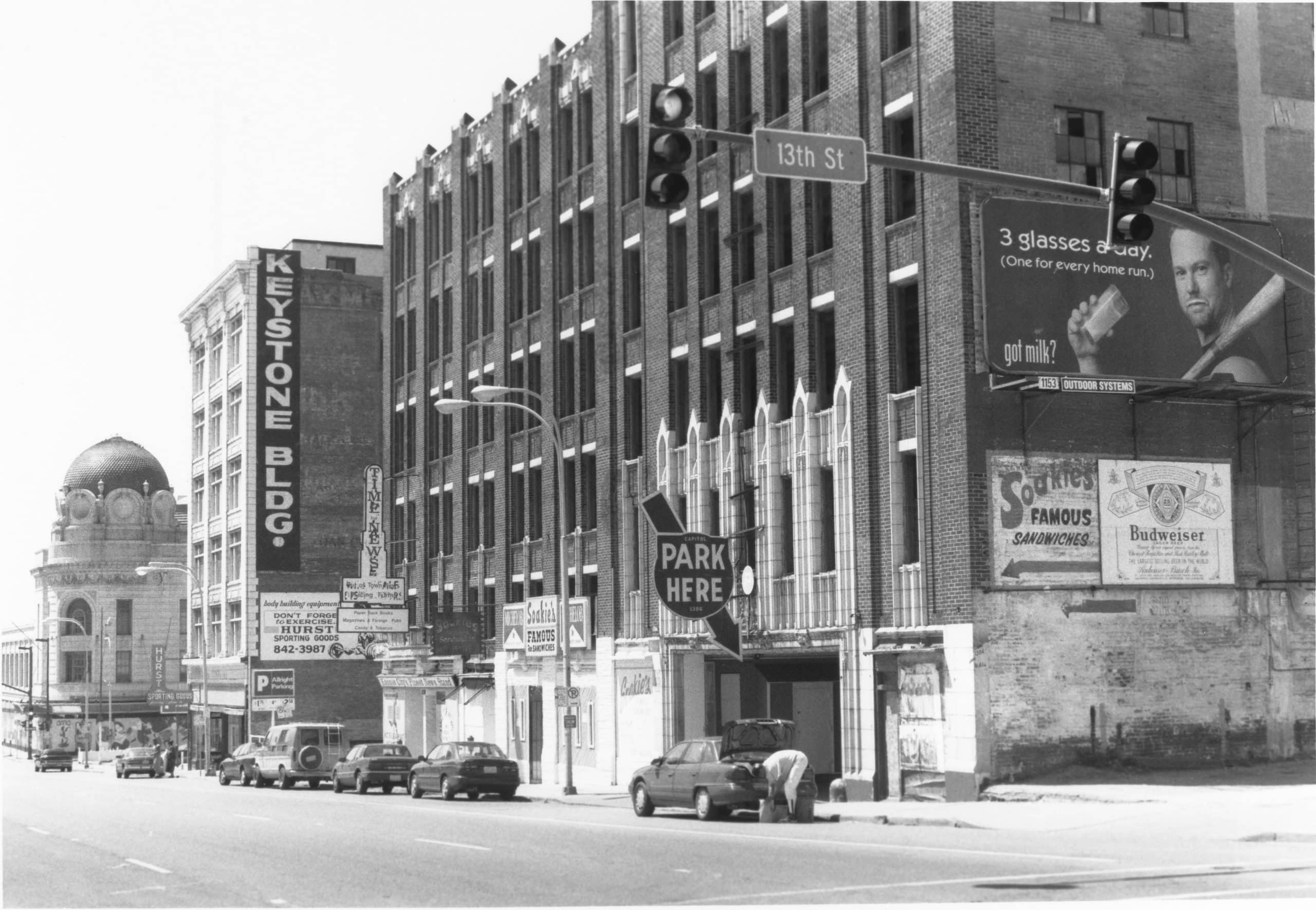First Photo: A picture of Soakie’s storefront posted on Reddit posted by user r/millerswiller on August 10, 2016. (Unknown, ca. 1994 – 2004.)2 Second Photo: A photo of 13th and Main Street from 1999; an ad for Soakie’s can be seen on the side of the 1300 building along with Soakie’s itself. (Photograph by Dory DeAngelo, 1999. MAIN STREET. Missouri Valley Special Collections, Kansas City Public Library.)3