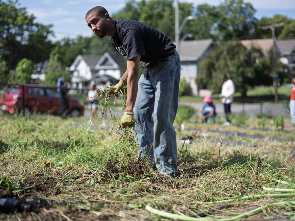 More than 60 volunteers joined the first three Hamer Free Food Program Farm Days at Ivanhoe Neighborhood Association and Young Family Farm KC. Organized by The Defender’s Mutual Aid team, Community Food Leaders and volunteers are learning Black agriculture and food sovereignty, and building hard skills in weeding, planting, seeding, packing, and coordination while we build community in the process.