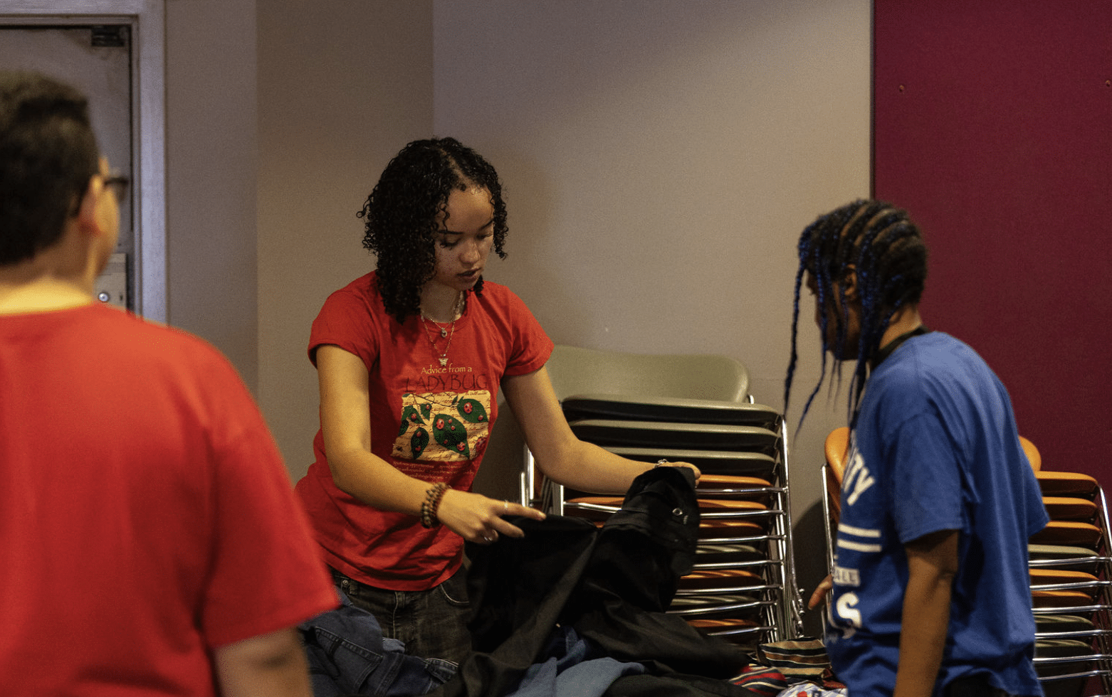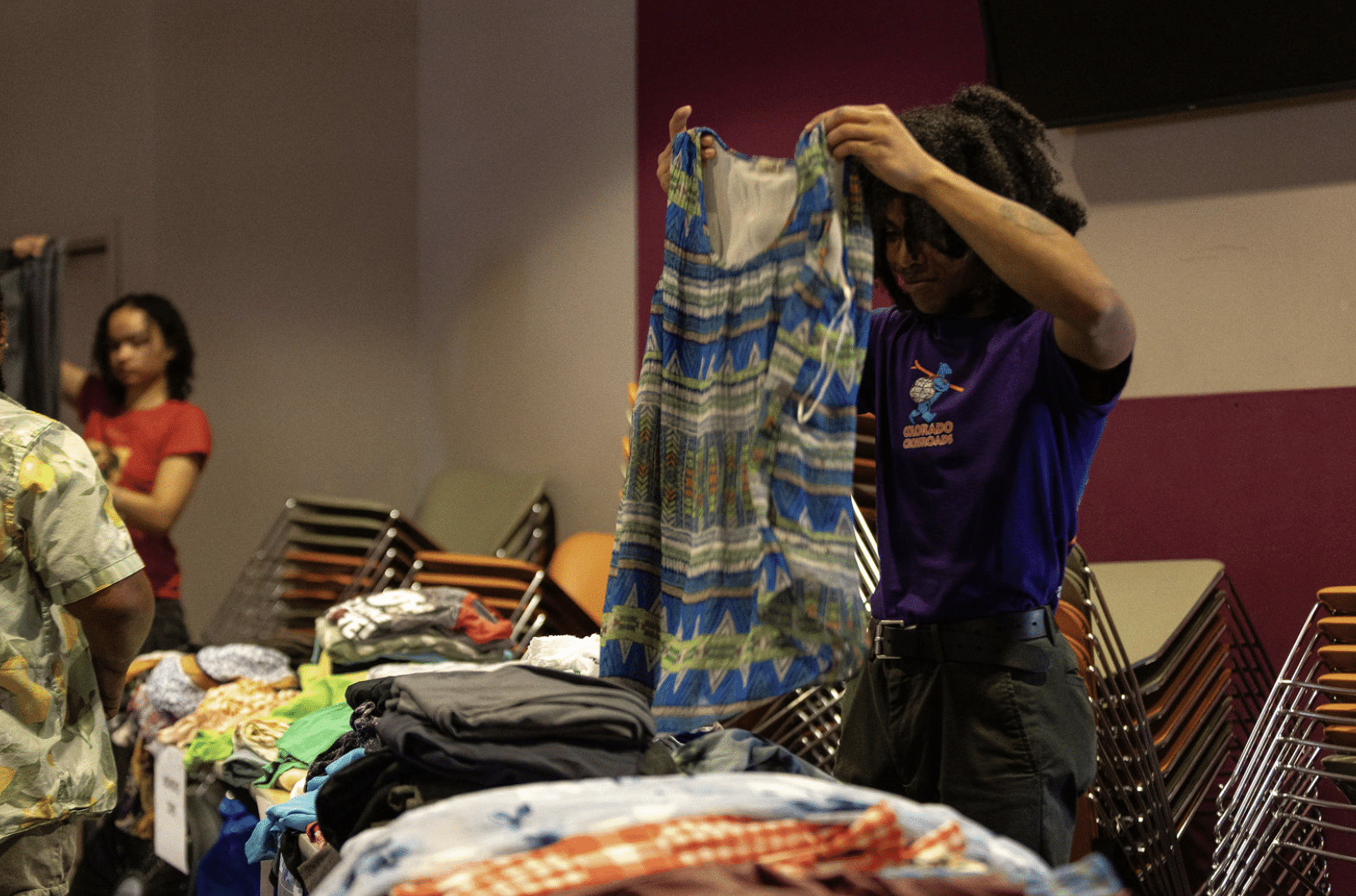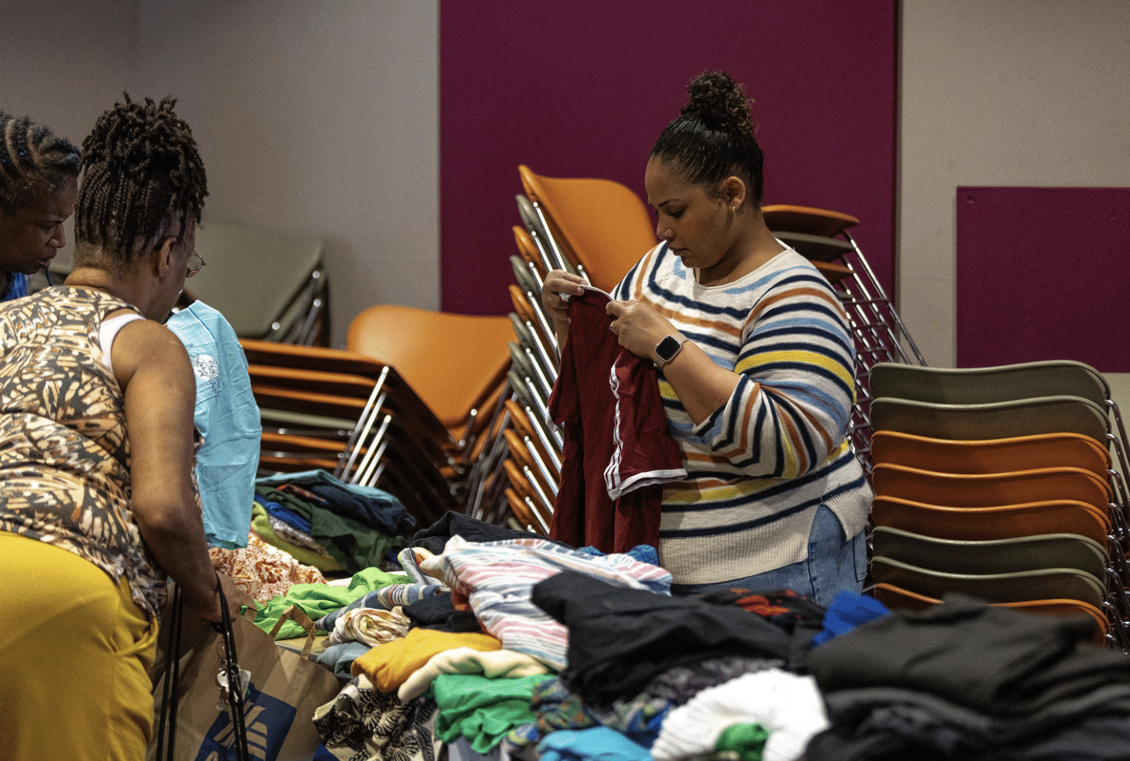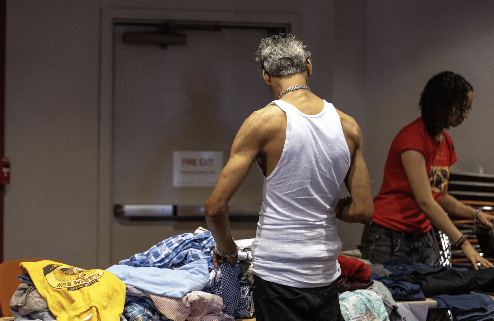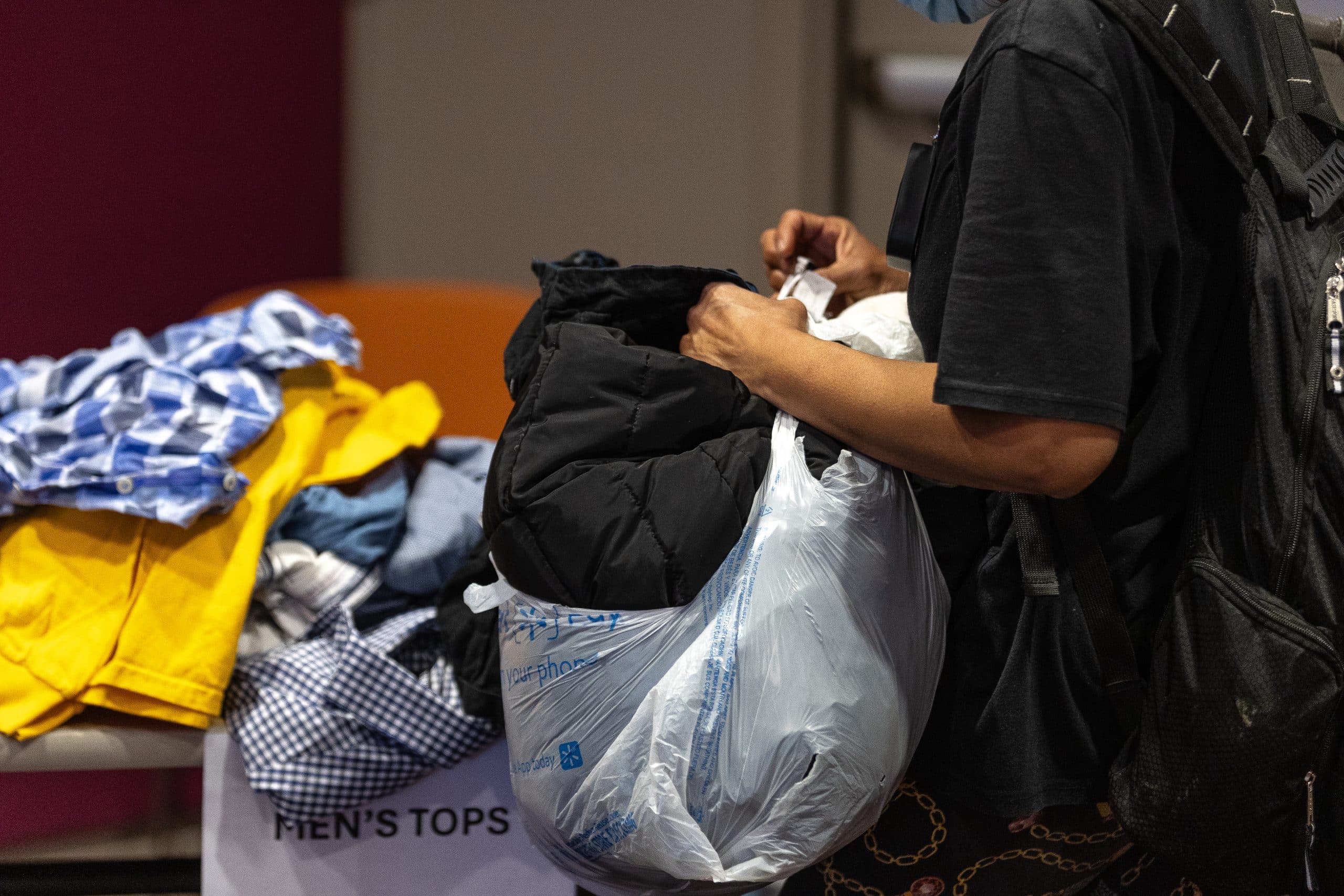 “It feels like a department store,” one community member told us, looking around at the tables of folded jeans, the racks of shirts hanging by size, the women’s tops, the men’s tops, the music playing through the room while folks moved between stations.