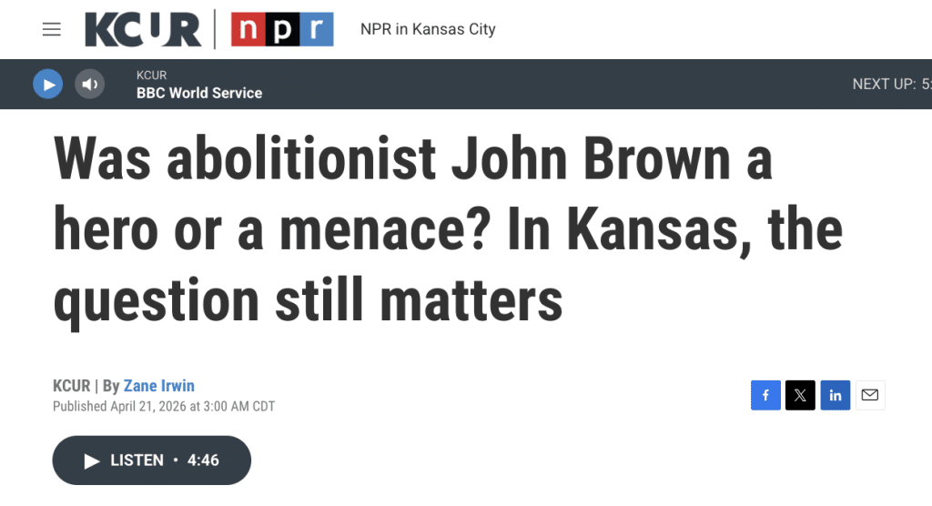 On April 21, 2026, the Kansas News Service, a public radio collaborative directed by Kansas City NPR affiliate KCUR, published a considered meditation on whether a man who was hanged in 1859 for trying to abolish the enslavement of human beings deserves to be called a hero. The piece does not reach a conclusion. The absence of one, in the tradition of white-led American public radio, is the conclusion.