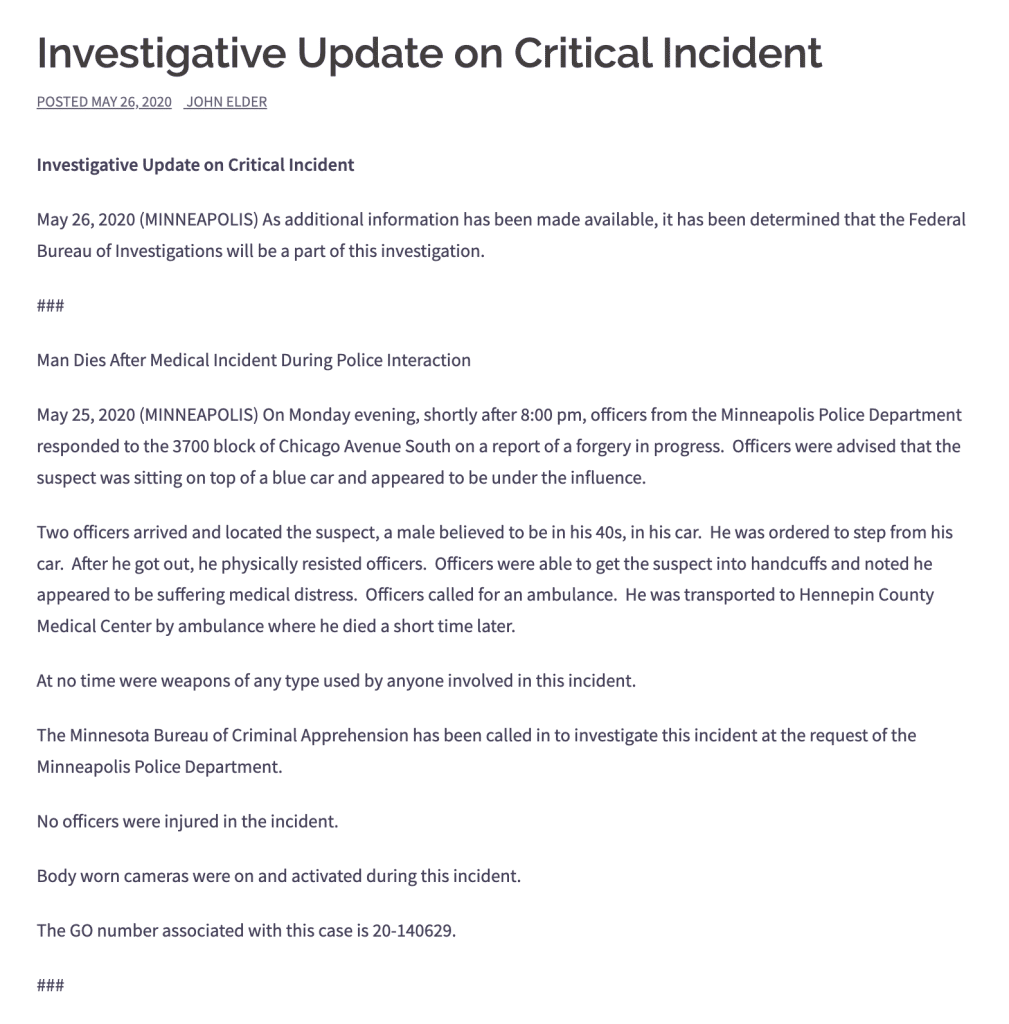 One clear example is the police report following the death of George Floyd which made no mention of the fact he was strangled by a cop for eight minutes. The police report headline reads, “Man Dies after Medical Incident During Police Interaction,” while the body of the report reads “He was ordered to step from his car. After he got out, he physically resisted officers. Officers were able to get the suspect into handcuffs and noted he appeared to be suffering medical distress. Officers called for an ambulance. He was transported to Hennepin County Medical Center by ambulance where he died a short time later.”